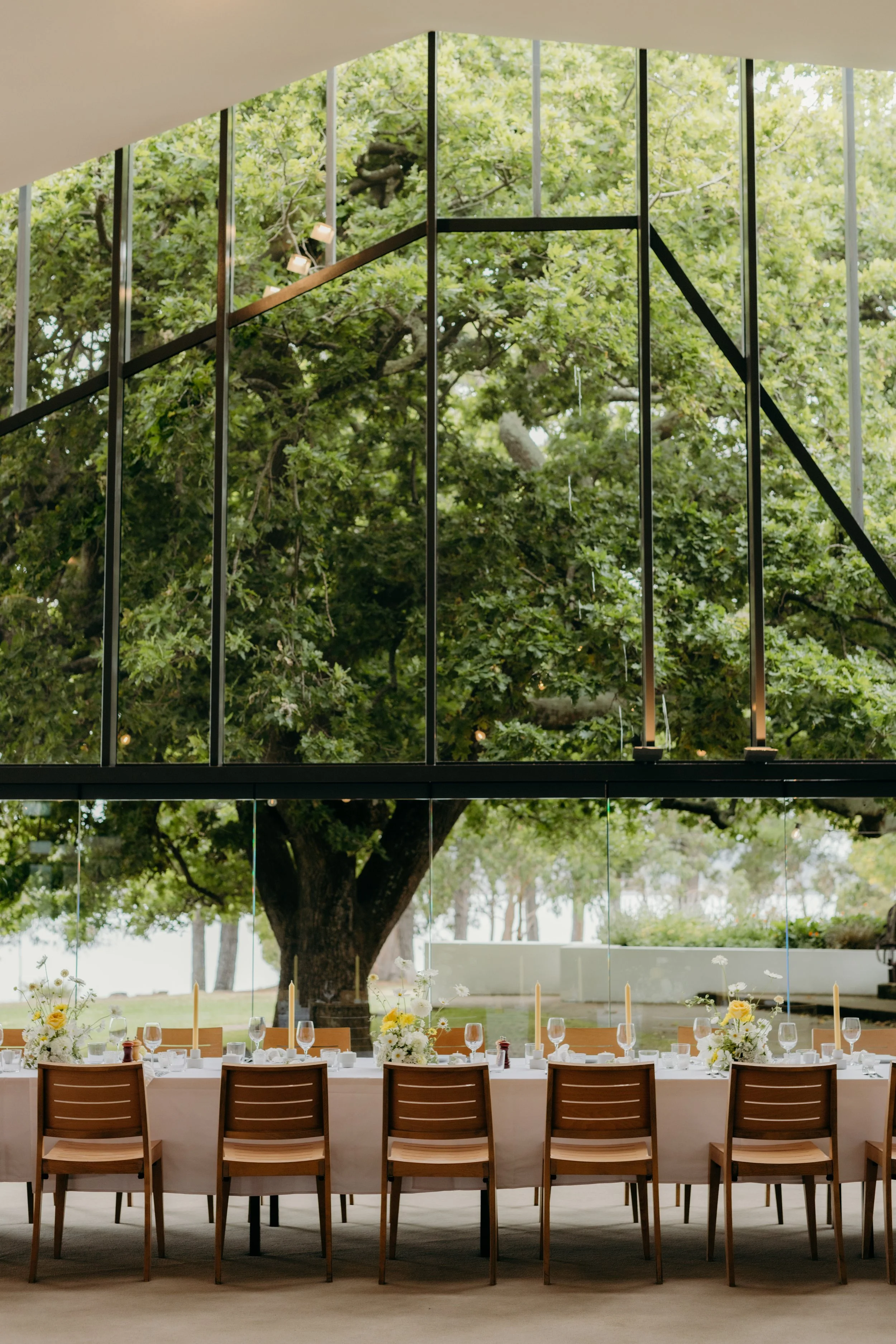 On arrival, guests are welcomed by the venue’s iconic oak tree and contemporary restaurant structure, set within manicured grounds that stretch to the water’s edge - an immediate sense of occasion that defines the experience.